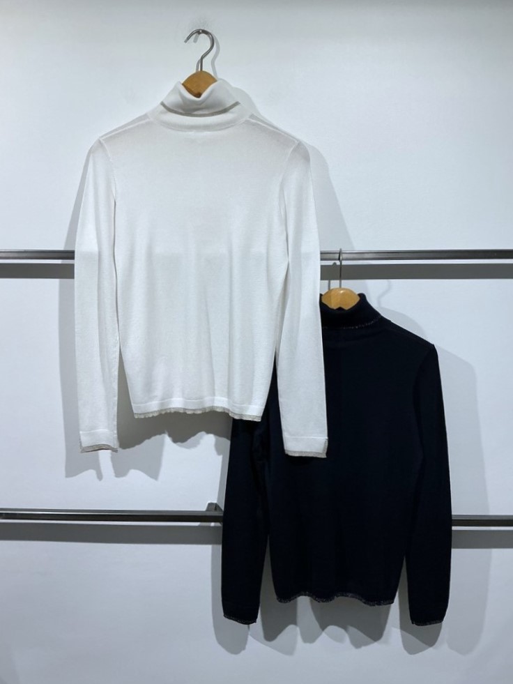 • Rollkragen, Ärmel-Bündchen und saum in feinem Rippenstrick mit Lurexkante
