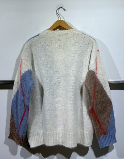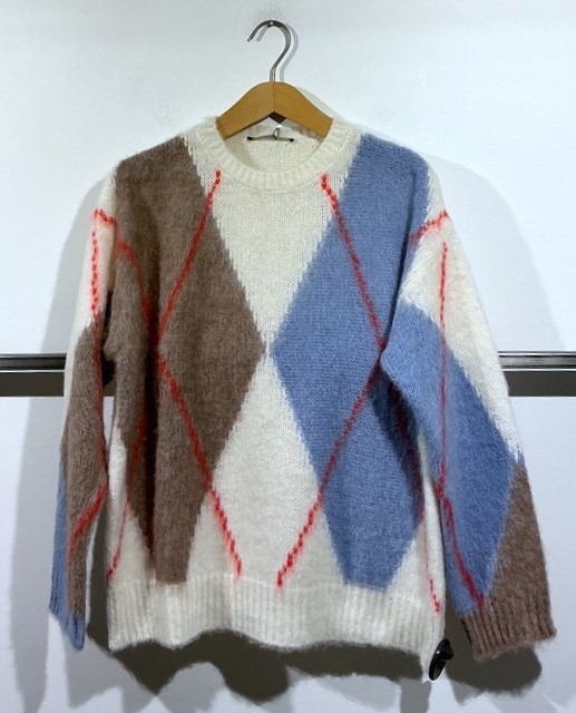 • Großes Rautenmuster mit Hellblau, Braun und orangeroten Akzenten vorne